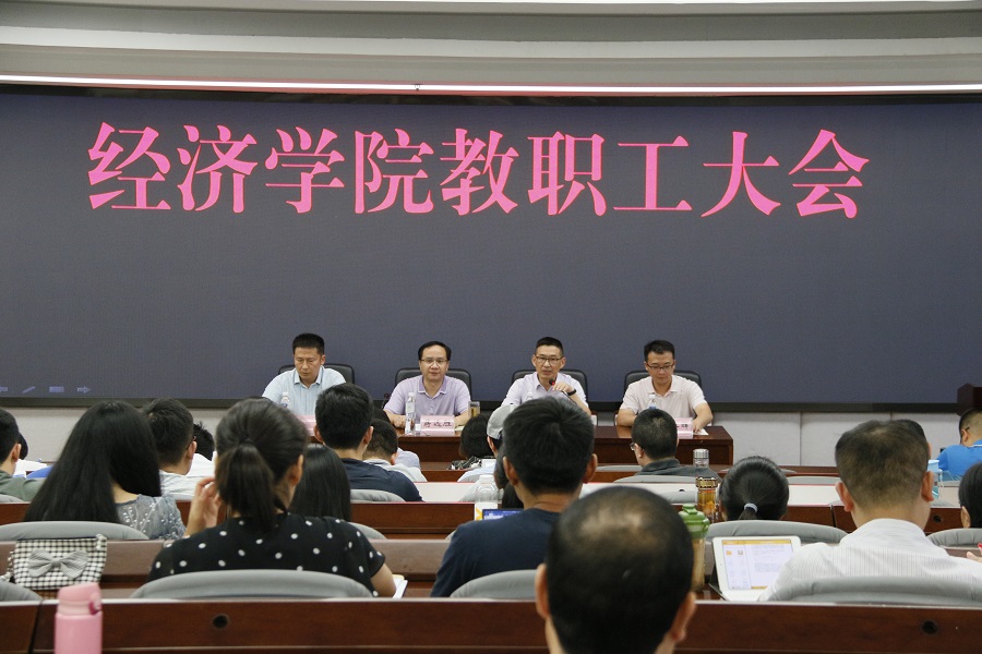 会上,院长蒋远胜代表学院领导班子感谢在假期冒着酷暑辛勤工作的教职工,传达了学校党委中心组(扩大)暨中层领导干部会议精神,并分析了当前经济学院、经济学科发展面临的新形势。一是全球经济形势下滑、中美贸易摩擦升级,保持经济5%增长率的只有中国、印度、东盟5国三大经济体,这给我们的经济金融科学研究带来了新的课题,也给我们的学生就业带来了巨大的挑战。二是“一流学科建设”和“一流本科专业建设”是当前高校发展新的引擎和动力,也是学院当前和今后比较长一段时期的发展方向和工作遵循。三是学校领导班子处在新老交替的时期,年轻干部的补充将成为常态。四是在学院空间资源受限的情况下,继续推进实验室建设。五是高级职称晋升改革对青年教师成长利好。