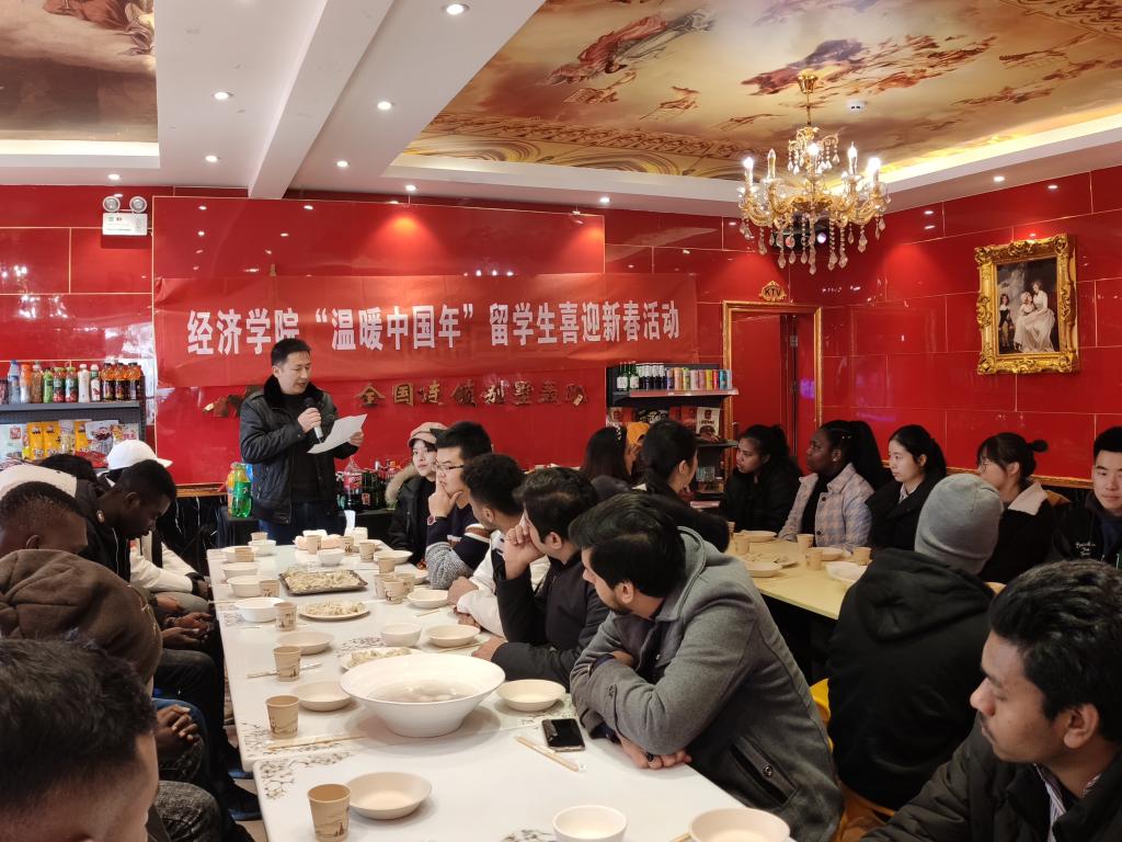 包饺子、猜灯谜、写福字、聊家常……1月20日,新春佳节将至,经济学院“温暖中国年”留学生迎新春活动火热举行,学院副院长吴平,学校党委副书记何仁辉,国贸系主任沈倩岭、副系主任宋涛和全体辅导员与来自乌兹别克斯坦、孟加拉、也门等12个“一带一路”国家的20余名寒假留校留学生欢聚一堂,共吃团圆饭,同庆中国年。