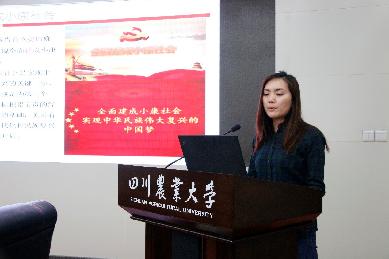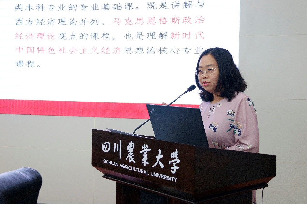 《政治经济学》课程团队成员、国贸系何思妤教授进行了《全面建设小康社会》的课程展示。回顾了从“小康社会”的提出到“四个全面”的历史进程;阐述了全面建设小康社会的内涵、目标、决胜路径、重要抓手;运用学校在凉山州脱贫攻坚的事迹作为教学案例。课程最后以习近平总书记给全国涉农高校的书记校长和专家代表的回信为勉,激发学生知农爱农之情、强农兴农之志。
