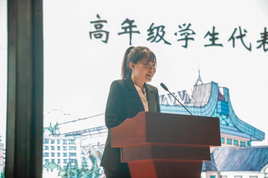 高年级学生代表、金融学201801班的陈秋悦发言。陈秋悦自入学以来学习成绩和综合测评成绩一直名列专业前三,长期担任学校、学院的主要学生干部,现任经济学院学生会主席,曾获多项校、院级荣誉和奖励。她期望2020级的同学们能够拥抱学院,感受集体;择善而从,坚持不懈;勇于担当,乐于奉献。在四年的大学时光中,能够不忘初心、不畏险阻、不负时代,用汗水去浇灌梦想,用奋斗书写青春华章。