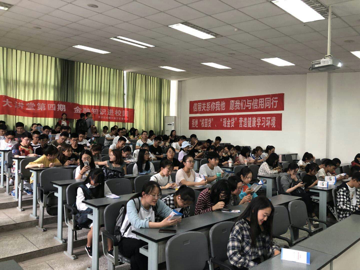 2018年9月18日,我院诚邀成都农商银行温江支行产品经理李航先生、财管部人员喻志琴女士来为我院学子开展防金融诈骗专题讲座。此次讲座由学院团委志工部负责组织,到场听讲座及讲解人员共计约110人。