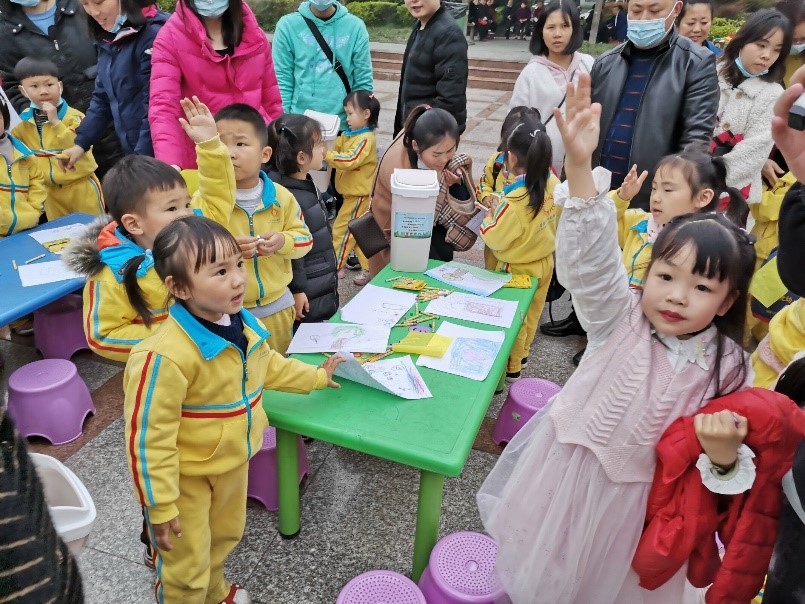 此外,在志愿者的引导下,小朋友们分为5组,纷纷用画笔绘出了自己的“绿色梦”,或是画了许多“参天大树”,又或是画出了种树的场景……绘画结束后,小朋友们迫不及待地向志愿者们展示自己的作品。“我画的是我和妈妈一起去公园种树,我觉得我画的最好”、“我画的是一片森林”……小朋友们纷纷介绍起来自己的绘画作品,想要在评比中夺得第一,在经过激烈的评选后,大家选出了每组画的最好的小朋友,为其送上了笔记本和彩笔等小奖品。