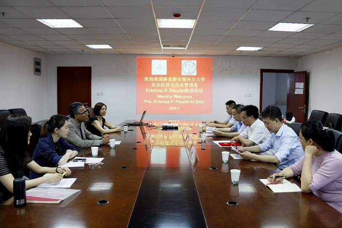 Dr. Paudel also affirmed the results of the cooperation between the two universities in the past few years. He shows great interests in projects of open short-term exchanges with American students, international business internships, and undergraduate exchanges after he learned about the exchange programs between the School of Economics of Sichuan Agricultural University and the universities in Britain, France and Germany. At the same time, both sides reached a consensus on the annual delivery of senior US experts to the Sichuan Agricultural University.