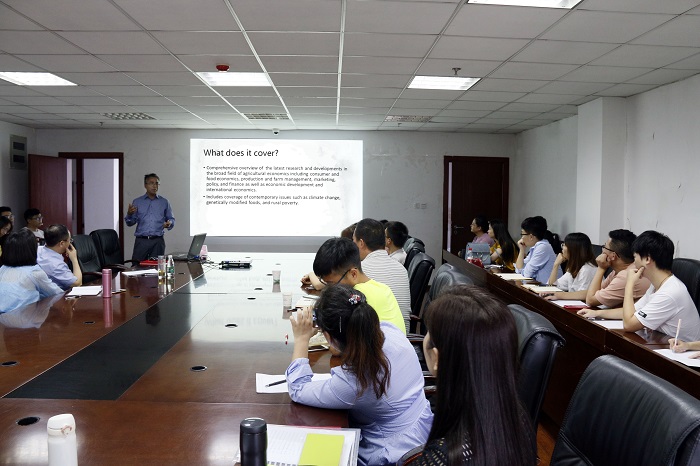 In the lecture, Dr.Paudel first introduced that the Handbook of Agricultural Economics is forward-looking and it summarizes the latest researches and developments in the field of agricultural. It mainly involves the studies of six aspects, from food economics, environmental resources to international trade. Then he shared the process and value of making this handbook, and elaborated some important model parameter involved in the handbook. Next, he analyzed the situation of discharge of sulfur dioxide and wastewater in some China cities, which aroused widespread concern among teachers and students.