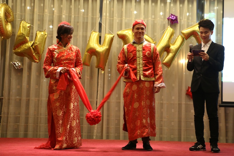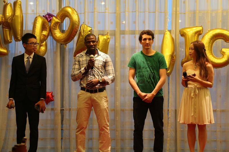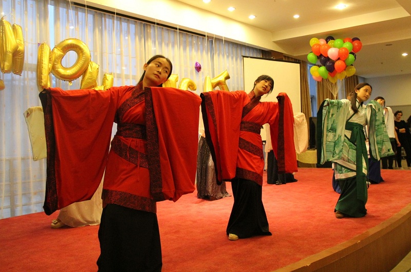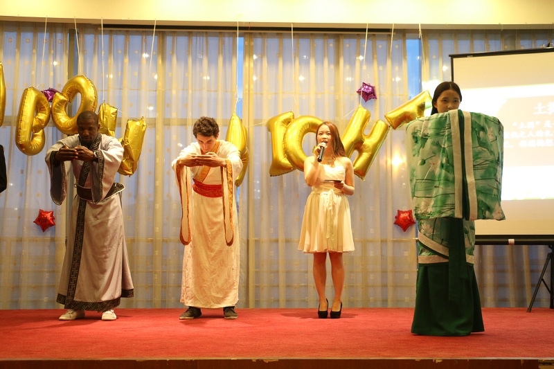 The event scene was decorated with colorful helium balloons. The golden letter balloon spelled out the theme of the party "Rainbow night", creating a warm, intimate, lively atmosphere. The hot samba dance performed by the jazz dance group of the College Students' Art Group and the international students opened the evening. The host who took the stage also interacted with Dami and Kauotar, foreign girls from Mexico and Morocco. After the introduction of the "State of Etiquette", the Han Culture Society also performed the interpretation and demonstration of the Han Dynasty to the international students and the audience. The standard posture of the foreign students also greeted the applause of the audience; two French students played the guitar to take out the interactive part of the Chinese and Western wedding performances, which also set off a small climax of the scene. Nicolas, who plays the bridegroom, stepped down to distribute the “candy” to the audience, sharing the joy of Rainbow Night to every audience; the Kung Fu Tea Show brought by the Tea Art Association also showed the beautiful Guzheng melody.finally, the party ended in the interaction of the calligraphy in the Southwestern University of Finance and Economics Painting and Calligraphy Association. The guests on the scene went on stage to sign with a brush to commemorate this unforgettable night.