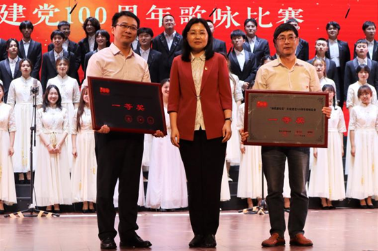 气势磅礴的合唱、精彩纷呈的表演赢得了在场老师同学的阵阵掌声,我院最终斩获本次“颂歌献给党”庆祝建党一百周年歌咏比赛一等奖,党委副书记、纪委书记何仁辉老师代表学院上台接受表彰。