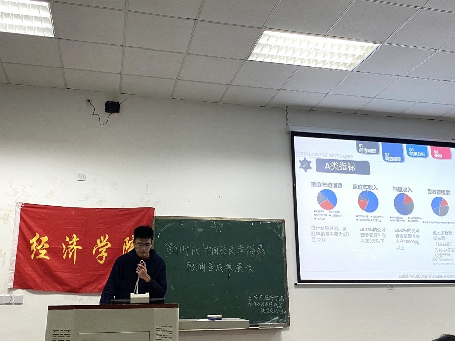 为加强课程思政教育,提高教学质量,经济学院开展了课程思政实践教学项目活动。11月26日晚上,政治经济学课程教学班在4A106举办了以“新时代”中国居民幸福感为主题的课程思政实践教学成果展示。出席展示的嘉宾有经济学院党委副书记、纪委书记何仁辉老师、政治经济学课程负责人李阳明老师、学院辅导员徐秋梅老师以及政治经济学教学班的百余名同学。