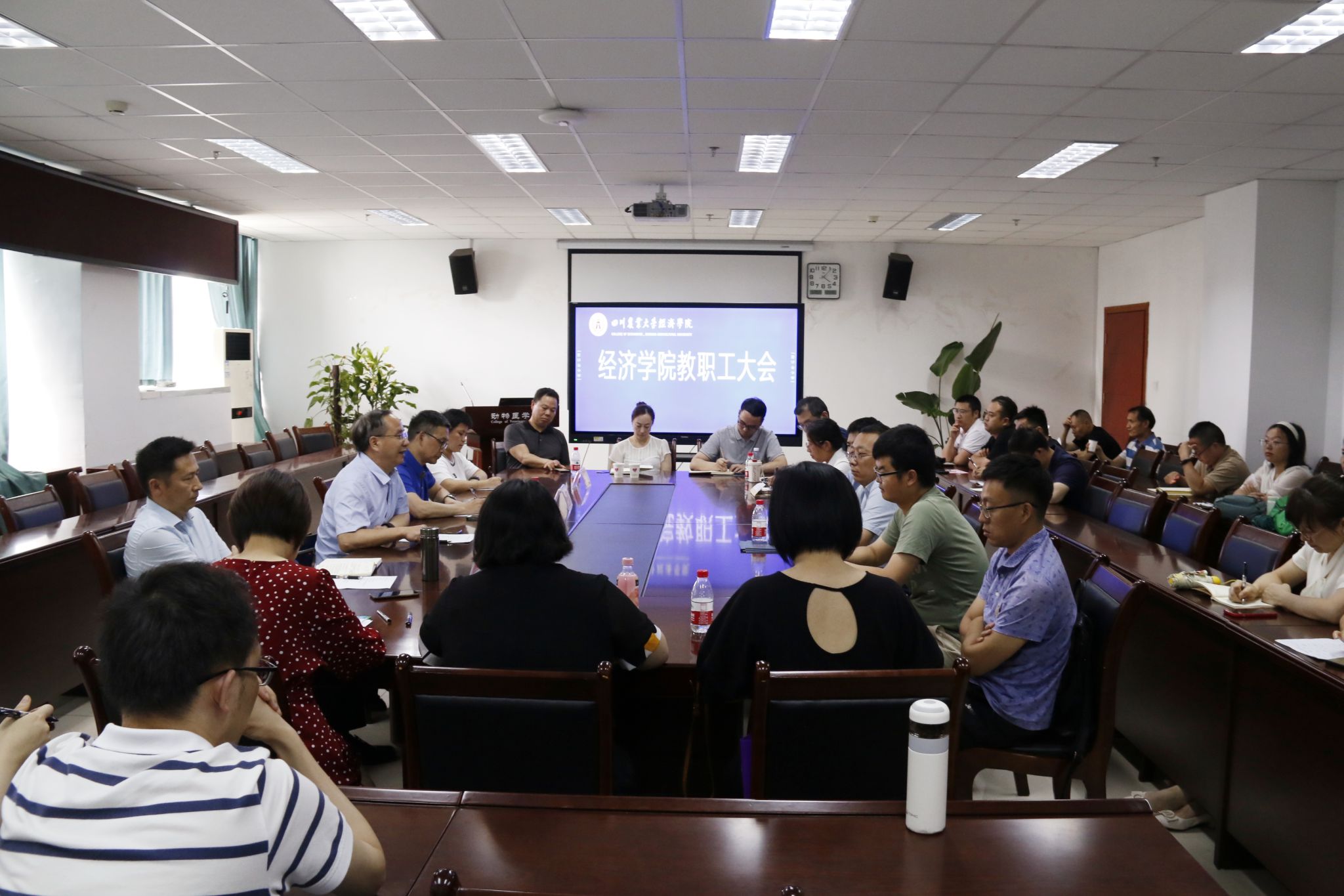 6月29日下午,经济学院在7教1109会议室召开本学期末全院教职工大会,总结回顾本学期工作,凝聚共识,振奋精神,统筹部署假期和下学期工作。会议由学院党委书记漆雁斌主持,学院全体教职工参加了会议。
