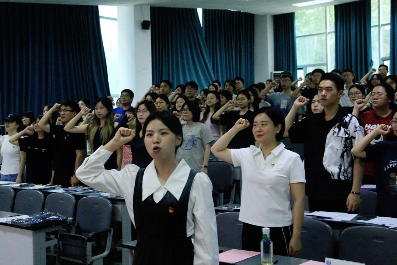 会后,全体毕业生党员面向党旗,胸前佩戴着闪耀的党徽,高举右手,用激昂的声音重温入党誓词。以铮铮誓言,再言入党初心,以嘹亮之声,表明报国之志。“我志愿加入中国共产党,拥护党的纲领,遵守党的章程……随时准备为党和人民牺牲一切,永不叛党!”鲜红的党旗下,回响着镌刻着信仰的声音。